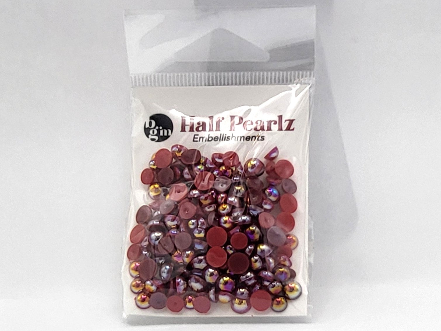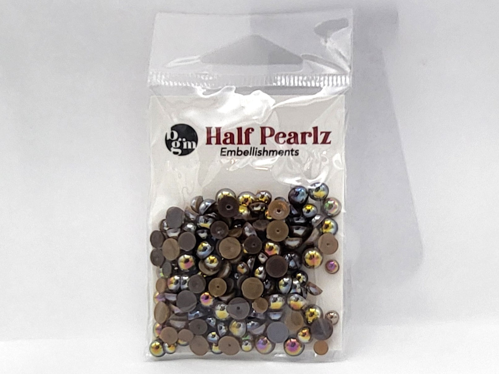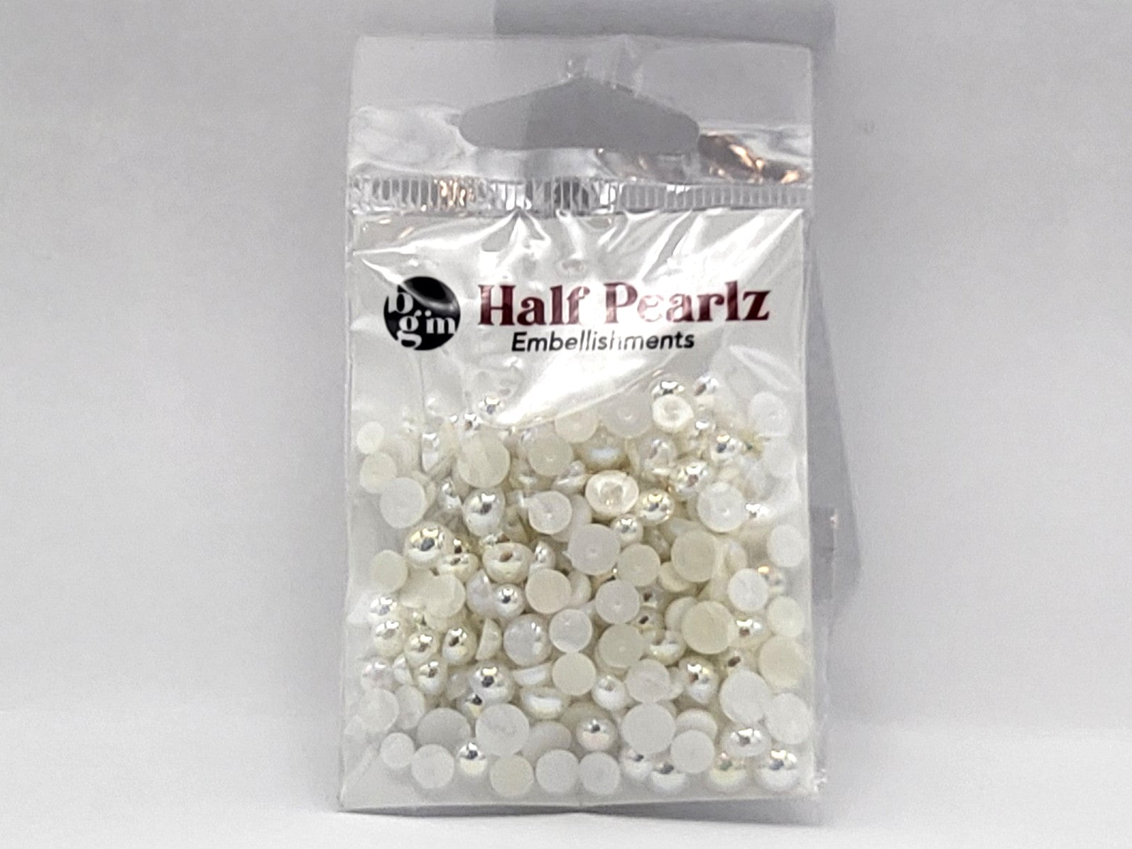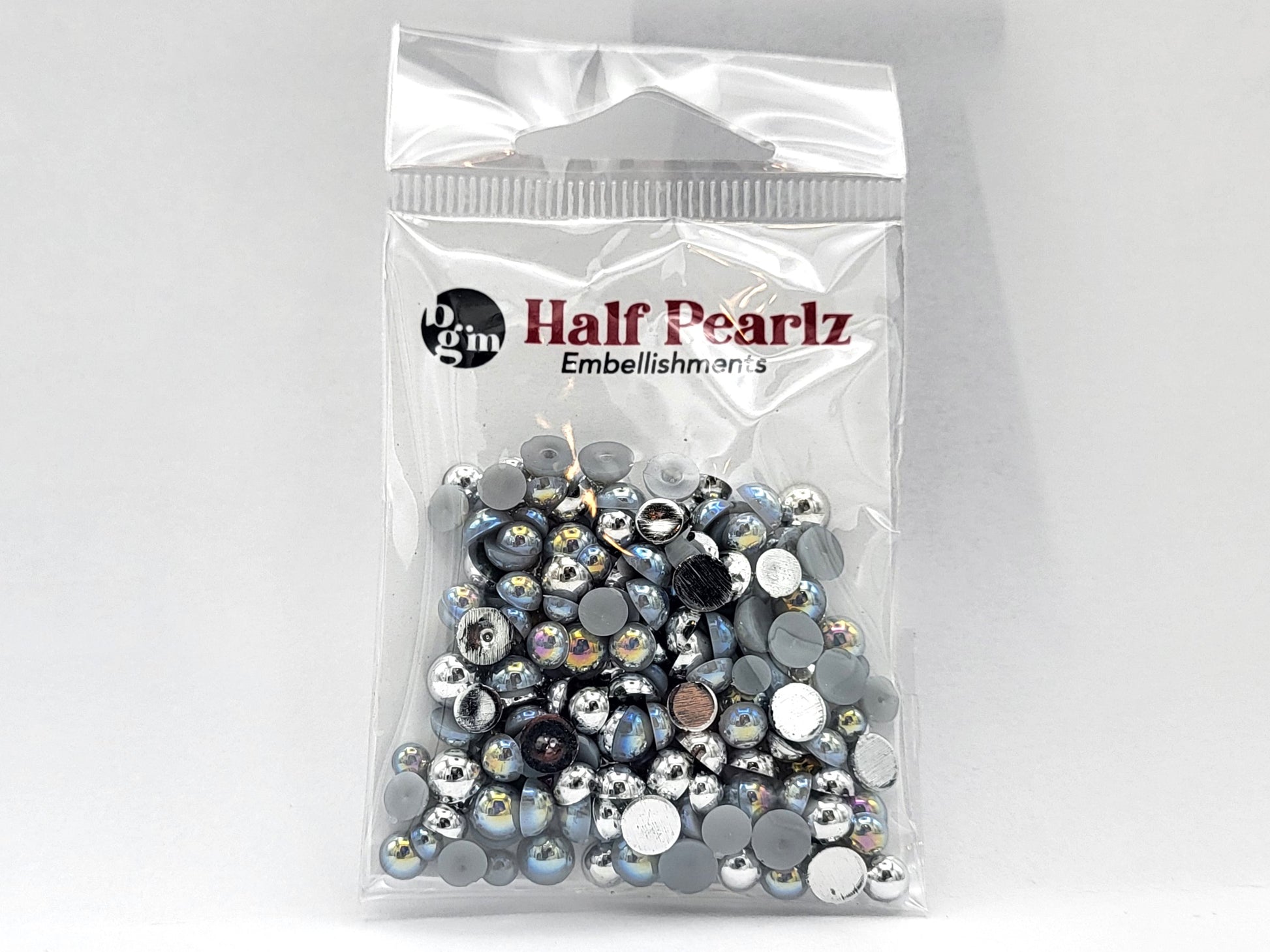 Buttons Galore and More Flat Back Half Round Pearls in an iridescent AB (Aurora Borealis) finish with a mix of three sizes in 4mm, 5mm, and 6mm. These craft embellishments are flat on the back and have a smooth round top. Add to your cards, scrapbooks, and more with a touch of glue to give your project a little dimensional pizzazz.