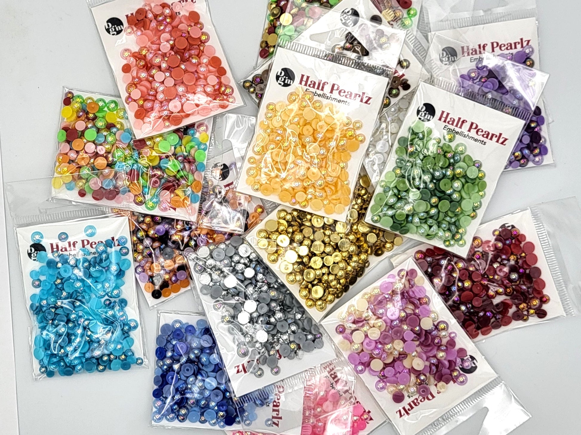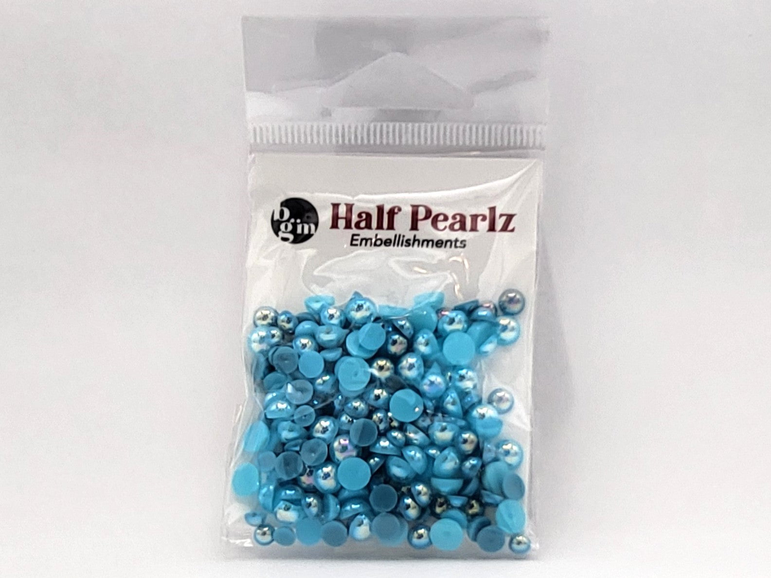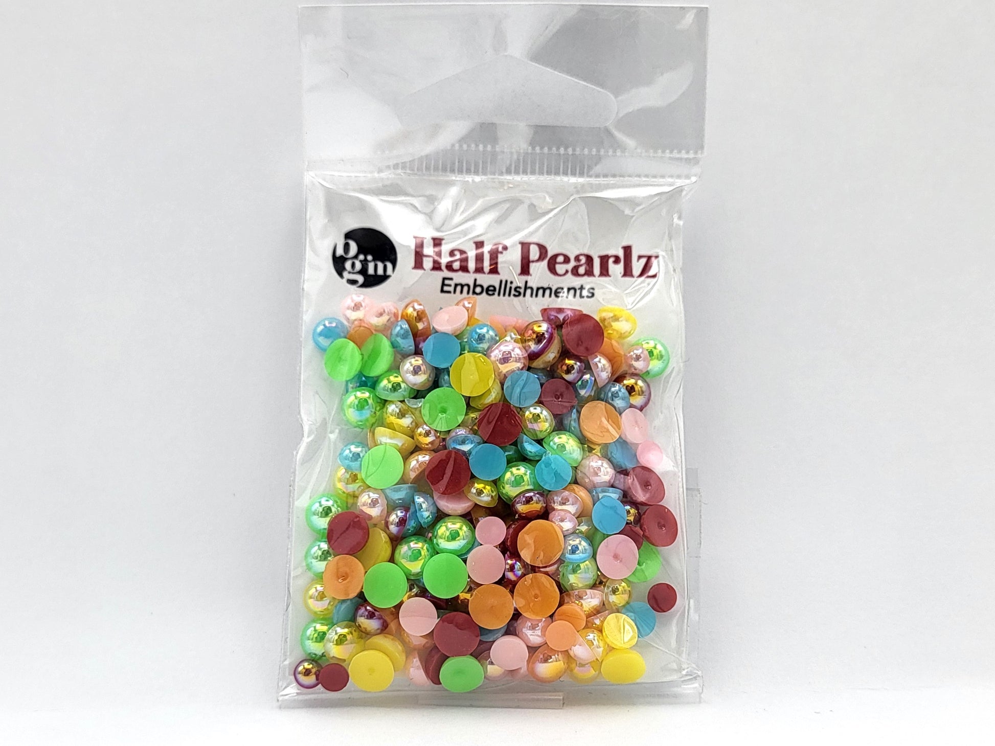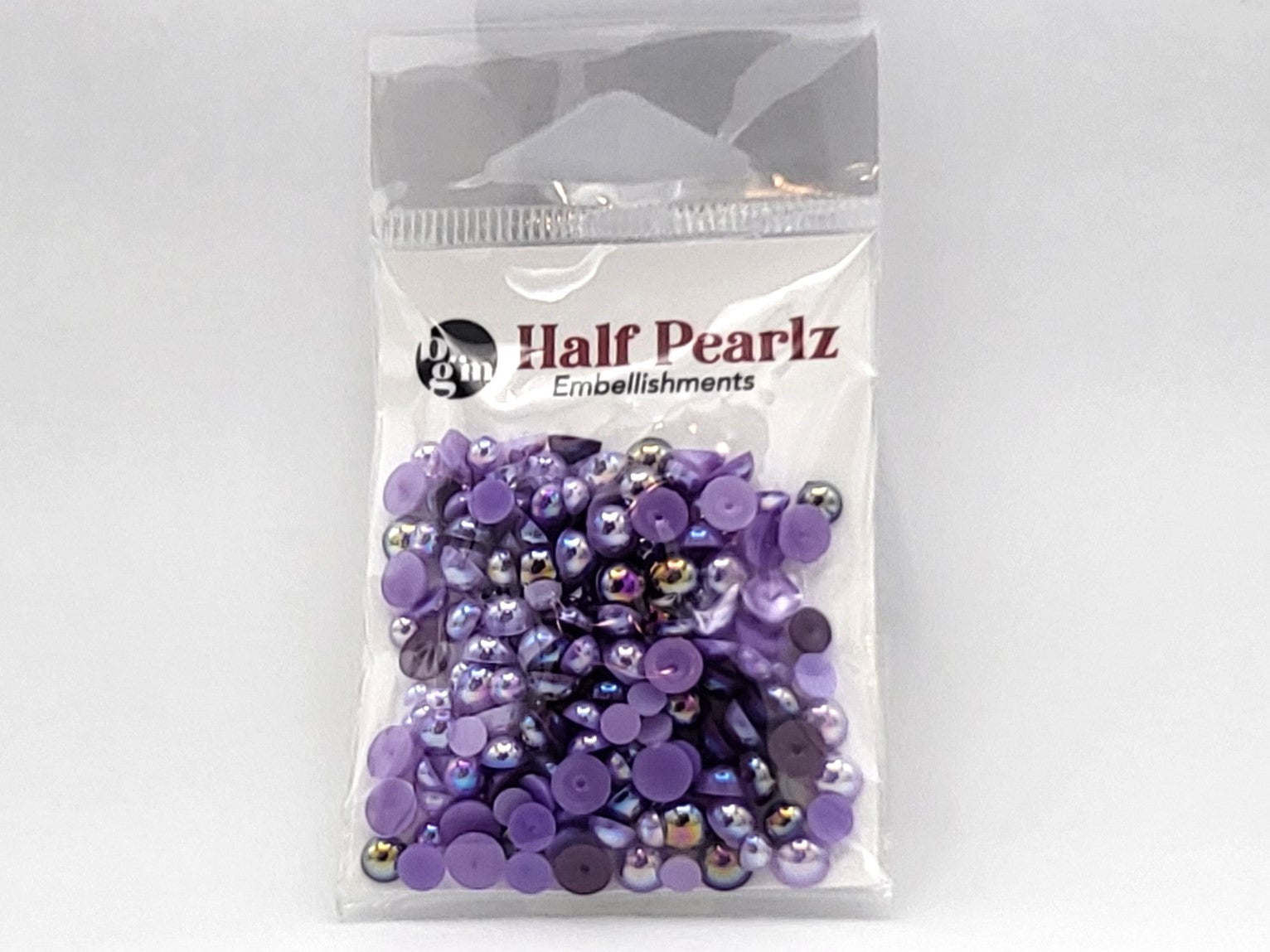 Buttons Galore and More Flat Back Half Round Pearls in an iridescent AB (Aurora Borealis) finish with a mix of three sizes in 4mm, 5mm, and 6mm. These craft embellishments are flat on the back and have a smooth round top. Add to your cards, scrapbooks, and more with a touch of glue to give your project a little dimensional pizzazz.