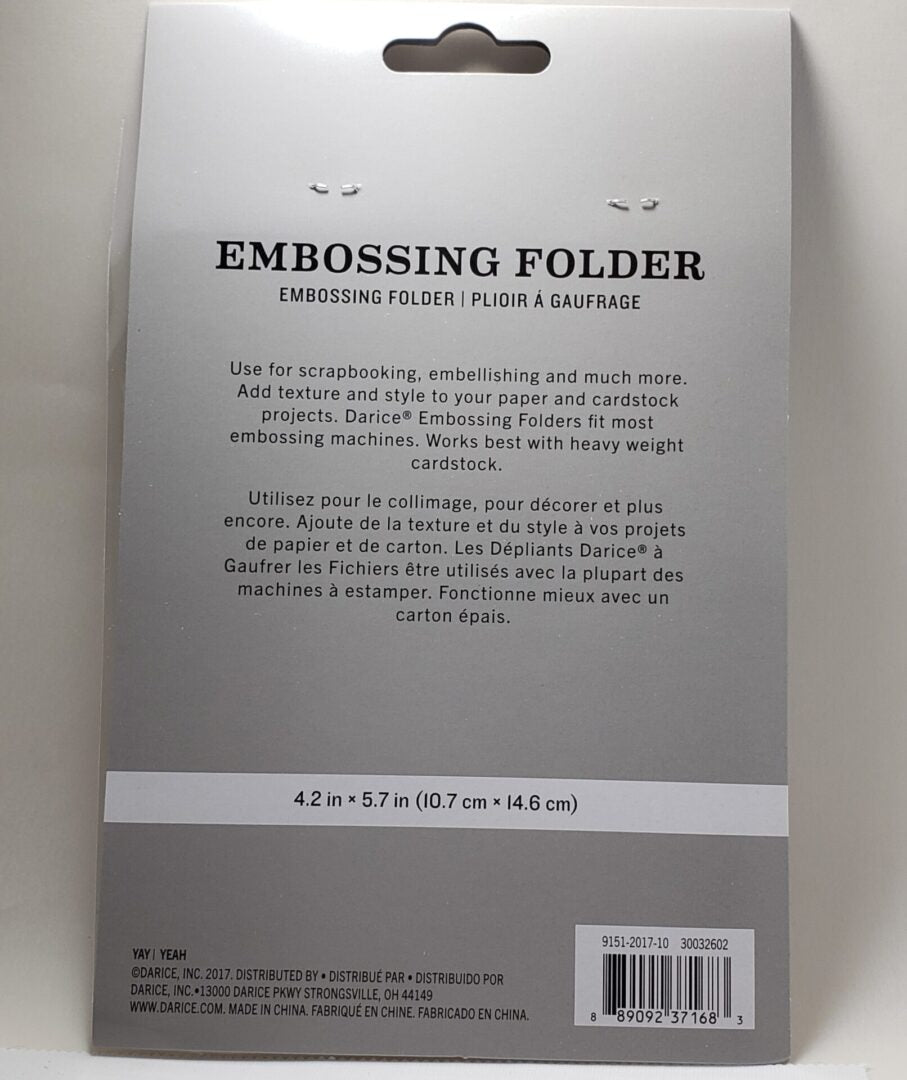 Darice Embossing folders are easy to use and make fun textured backgrounds and embellishments for your paper crafting projects. The folders are sized for A2 cards and measures approximately 4.25" x 5.75". Compatible with most embossing machines such as the Sizzix Big Shot, the Provocraft Cuttlebug, and many others.