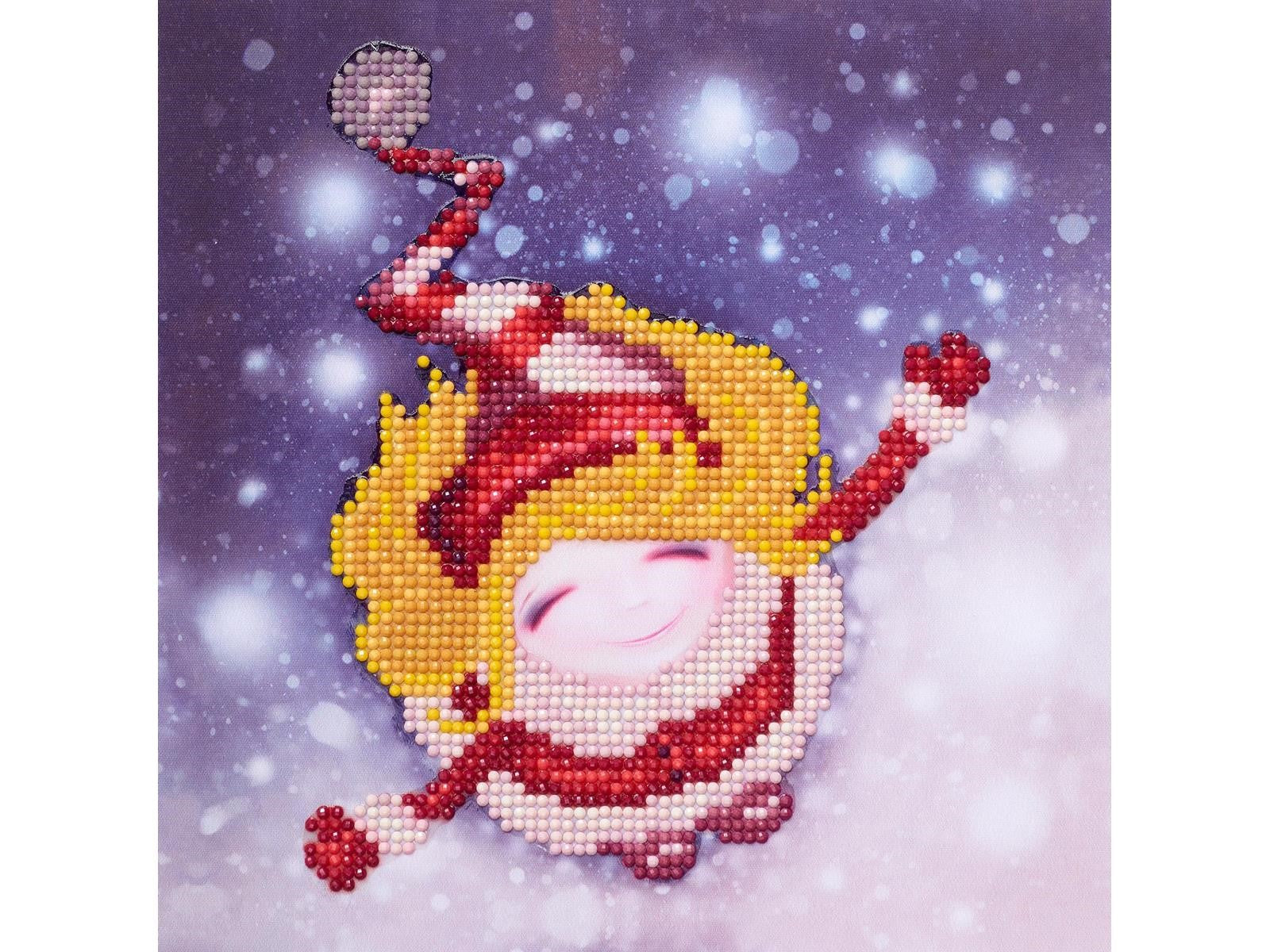 Start diamond painting with Diamond Art by Leisure Arts, powered by Diamond Dotz! This is a Beginner 8"x 8" Girl In Snow. Feeling the magic of winter as snow falls on this holiday fashioned dressed girl, with a snow flake filled night sky background.