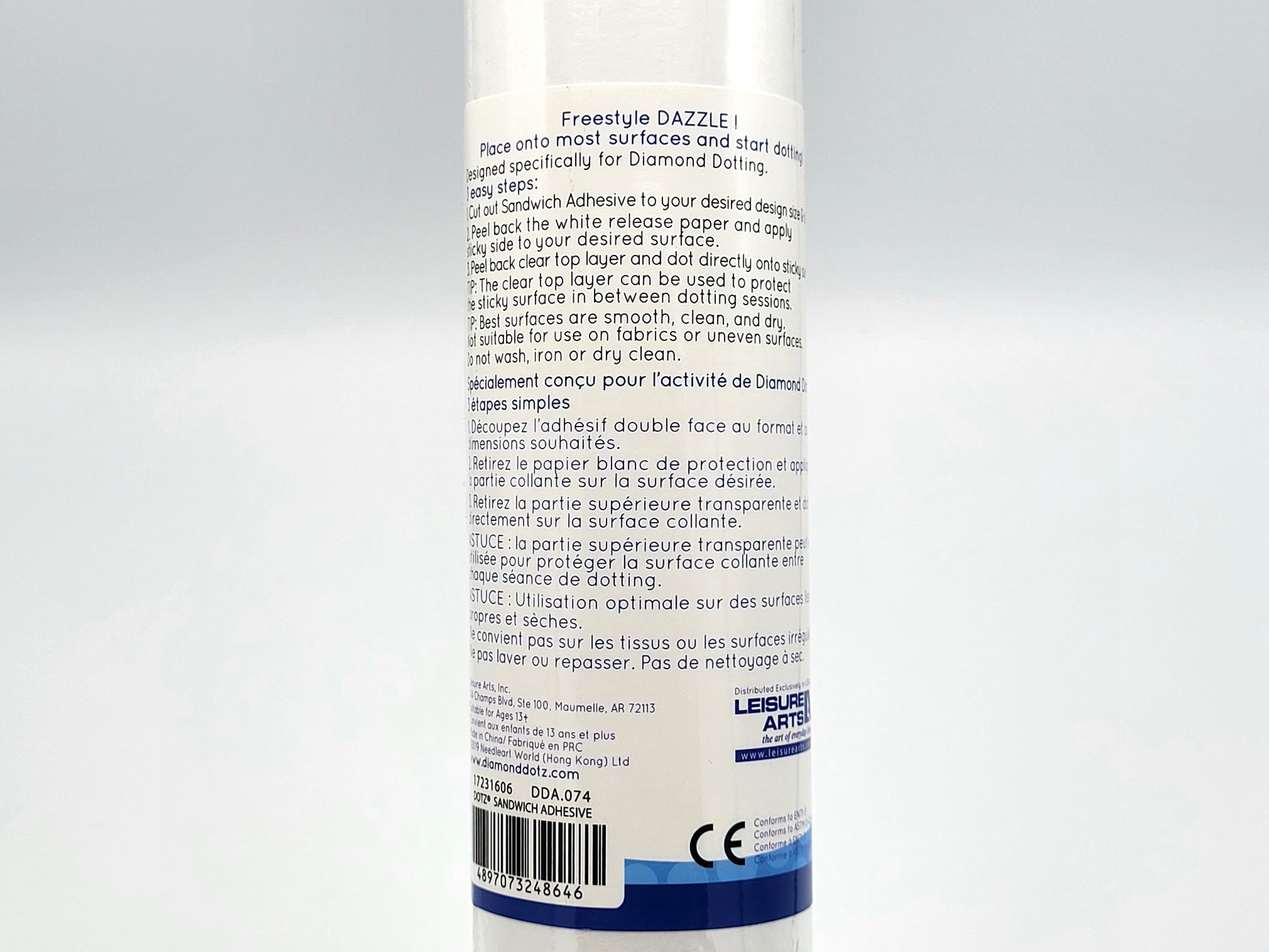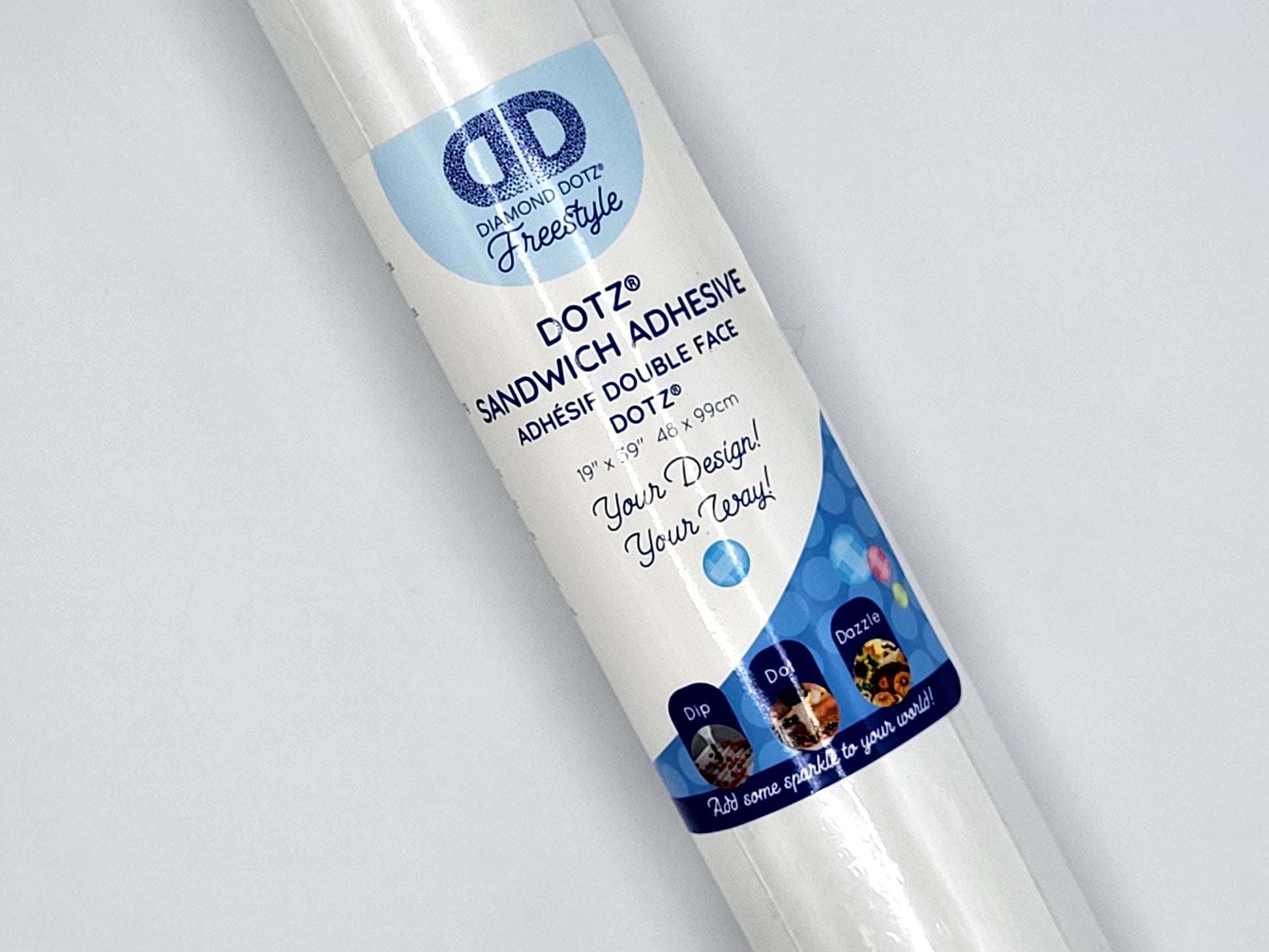 Stick with ease using the Dotz Sandwich Adhesive Roll – 48 x 99cm (19 x 39 in). Designed for freestyle or custom diamond painting projects this double-sided adhesive sheet makes it easy to turn nearly any smooth surface into a sparkling masterpiece. Simply cut to your desired size and apply to a clean flat surface – then peel back the top liner and start dotting! Ideal for use with diamond painting canvas alternatives or to add sparkle to cards wood and more this roll is a versatile staple for your diamond art toolkit.