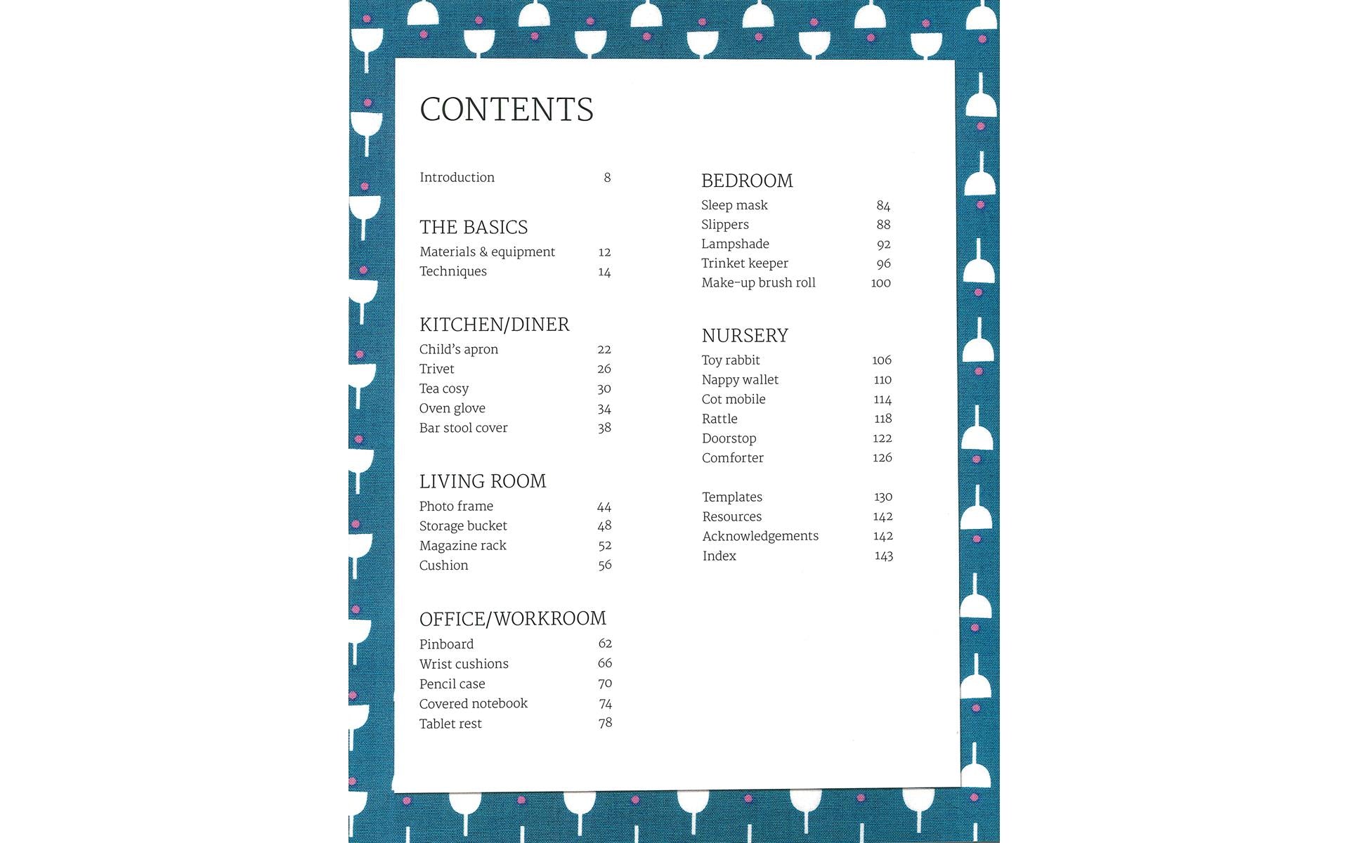 Projects include: oven glove, child’s apron, door stop, magazine holder, pencil case, eye mask, bedside lampshade, slippers, cot mobile, child’s comforter, and more. Each project has easy-to-follow instructions and beautiful photography plus a handy tools and techniques section.