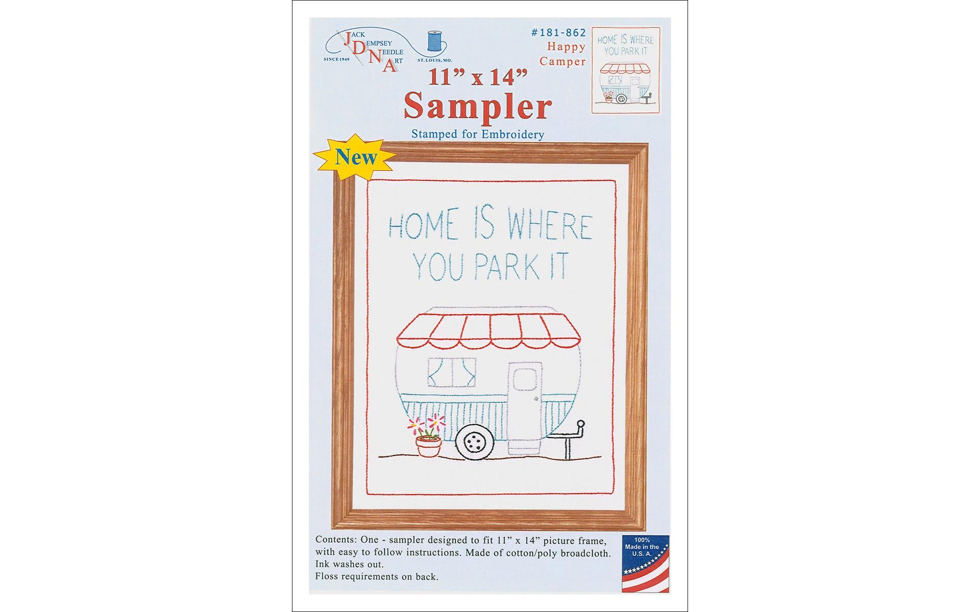 Jack Dempsey Samplers contains a pre-printed sampler designed to fit a picture frame. Made of cotton/poly broadcloth. Image of a camper trailer with an awning and flower pot. Caption reads home is where you park it.