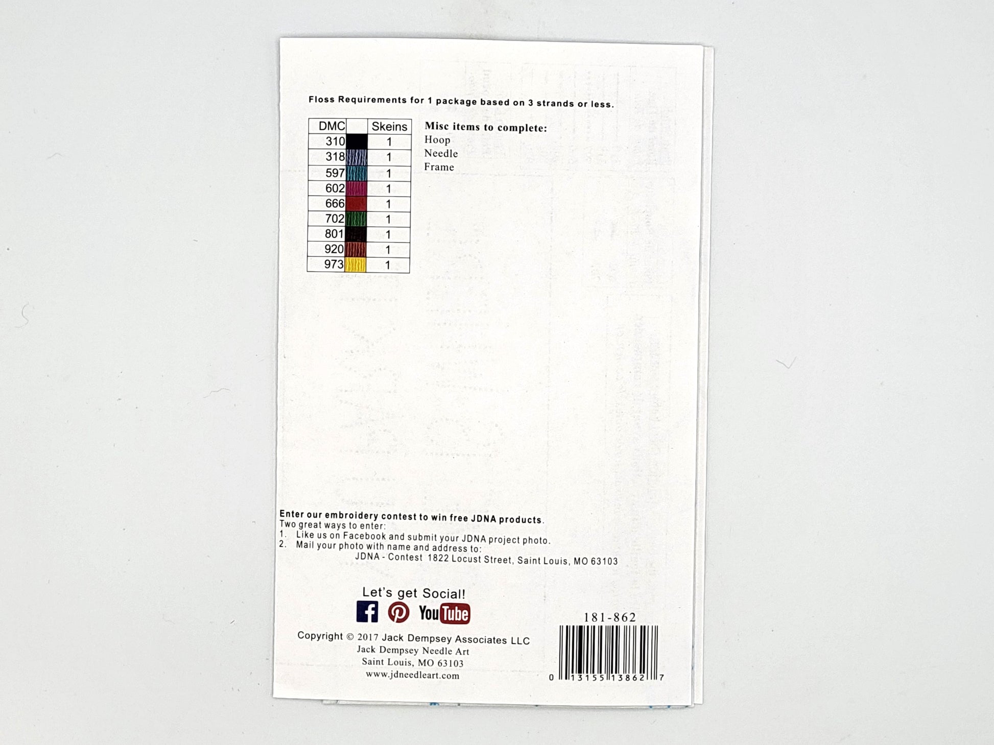DMC floss colors needed are: 310, 318, 597, 602, 666, 702, 801, 920, 973.