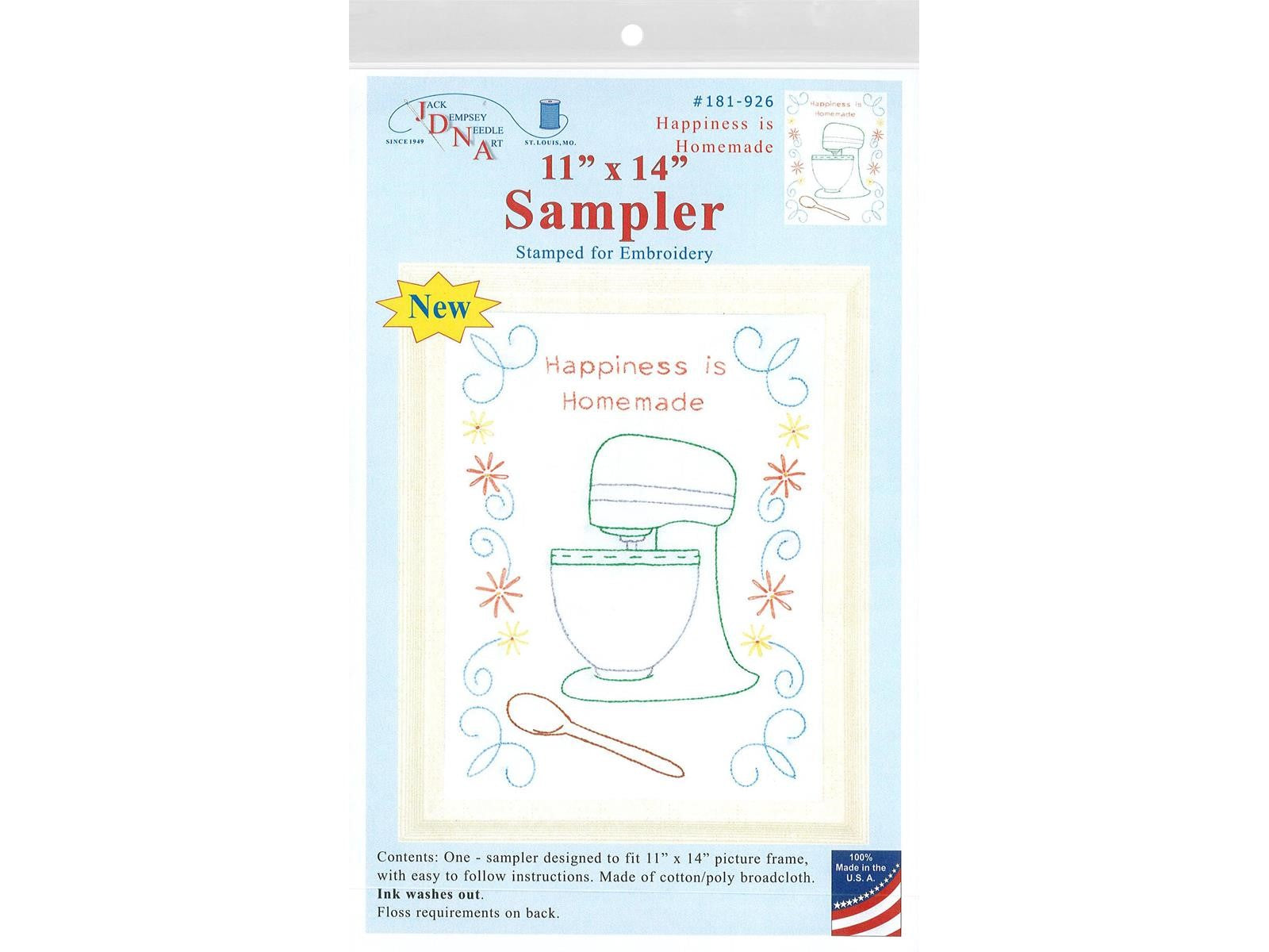 Jack Dempsey Samplers contains a pre-printed sampler designed to fit a picture frame. Made of cotton/poly broadcloth. The design is a stand mixer with a wooden spoon next to it and the caption happiness is homemade written above it. Flowers and swirls line either side of the image.