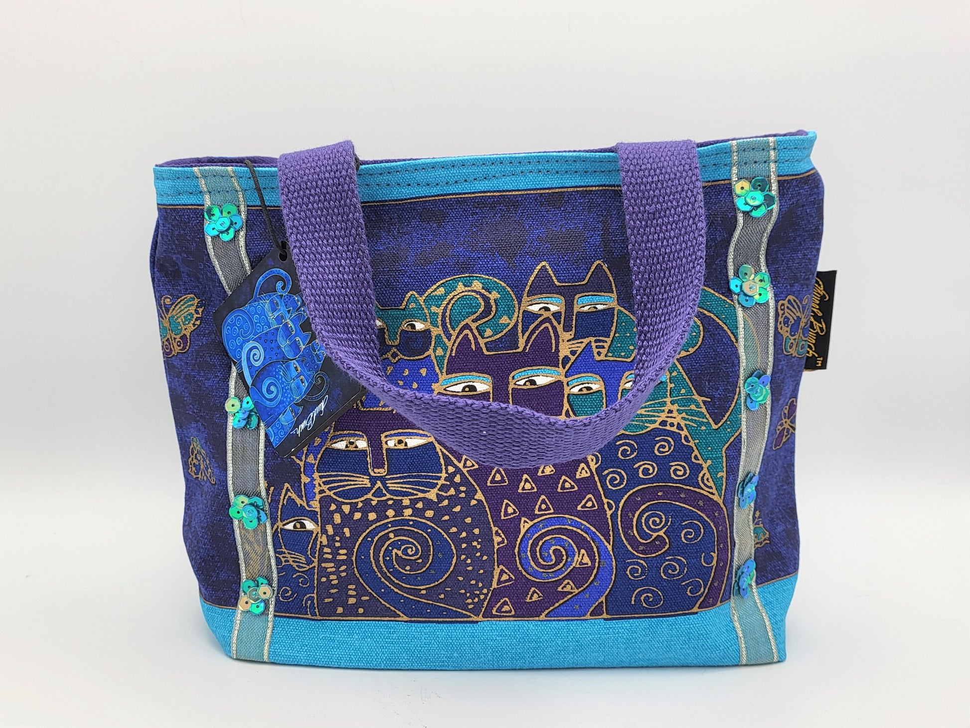 Laurel Burch Sun n Sand Indigo tote is a small canvas tote bag, lightly adorned with sequins and ribbon, and includes wooden key chain with cat image. The bag has a reinforced square bottom, fun and sturdy zipper pull, fabric handles for comfort, and is water resistant inside!