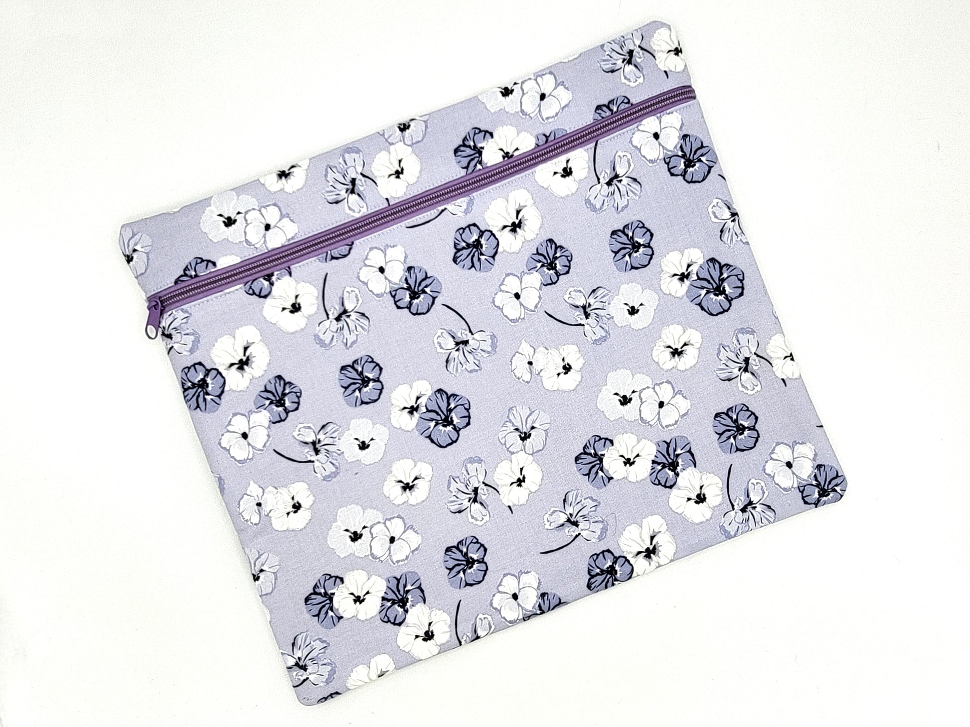Periwinkle Blue Pansy Floral Print Project Bag for Cross Stitch, Embroidery, and Sewing Notions Storage | 13.75x12" medium