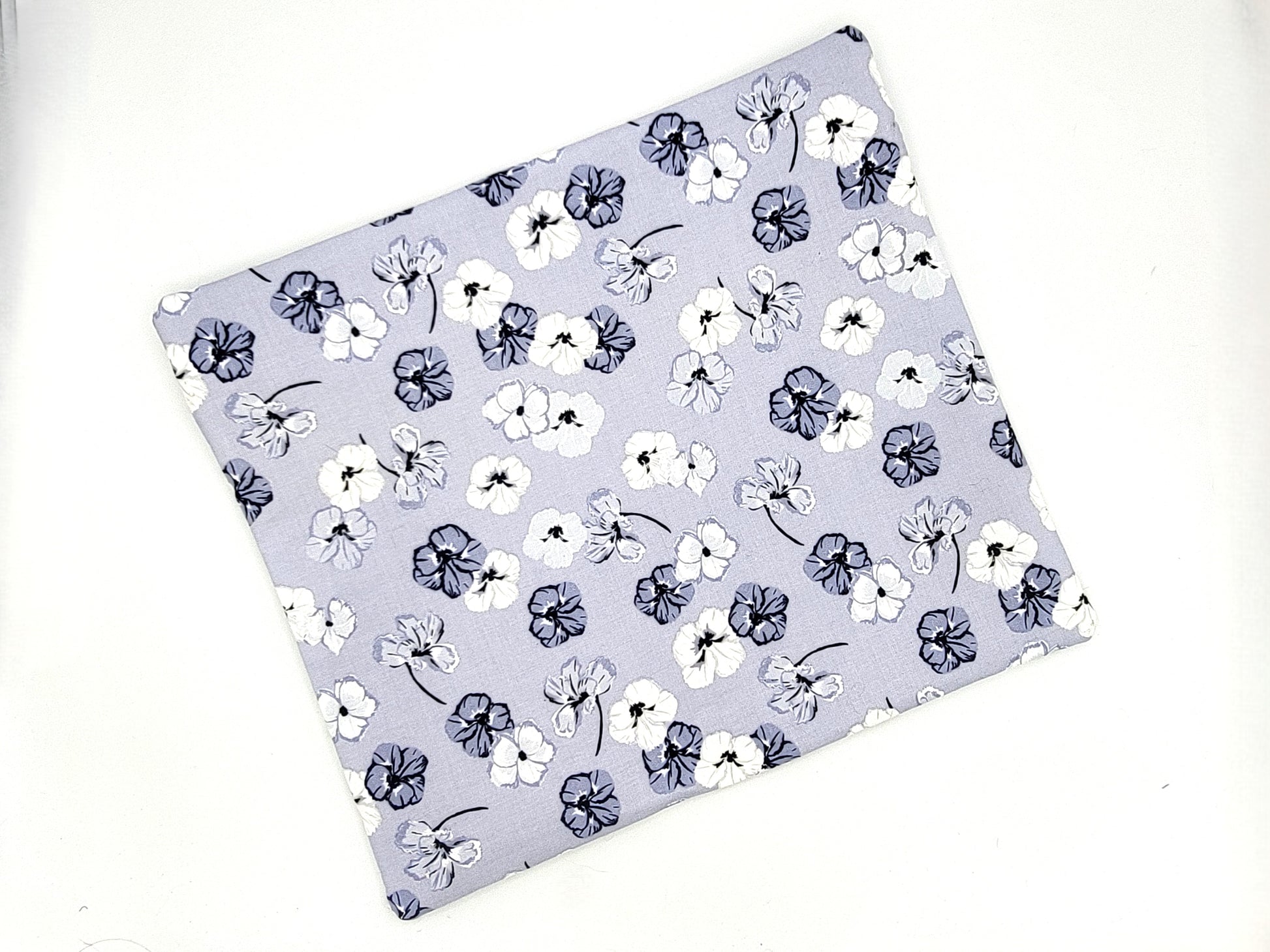 This project bag is a subtle periwinkle color fabric with white and blue pansies. It is fully lined with a coordinating solid purple fabric. All fabric is 100% cotton.
