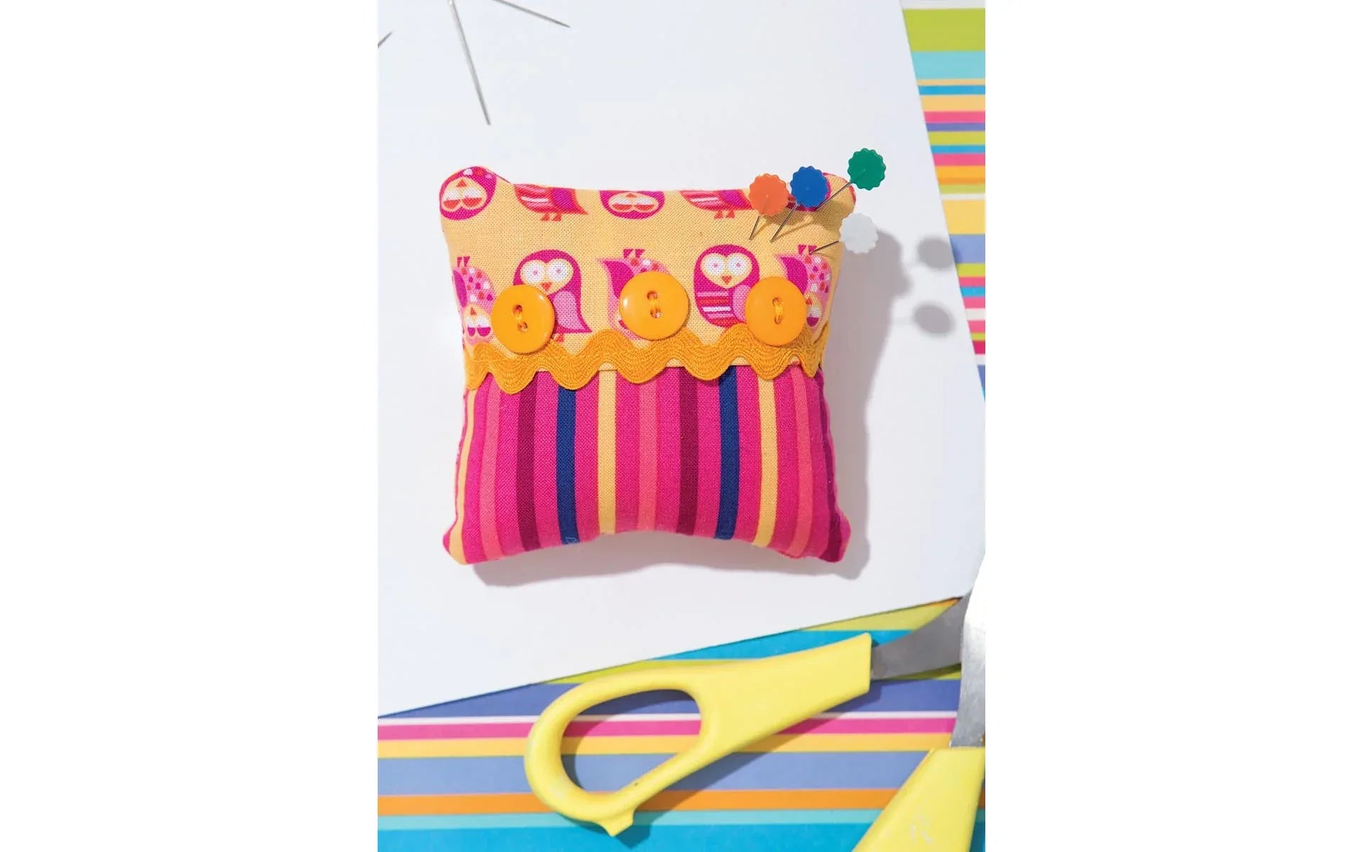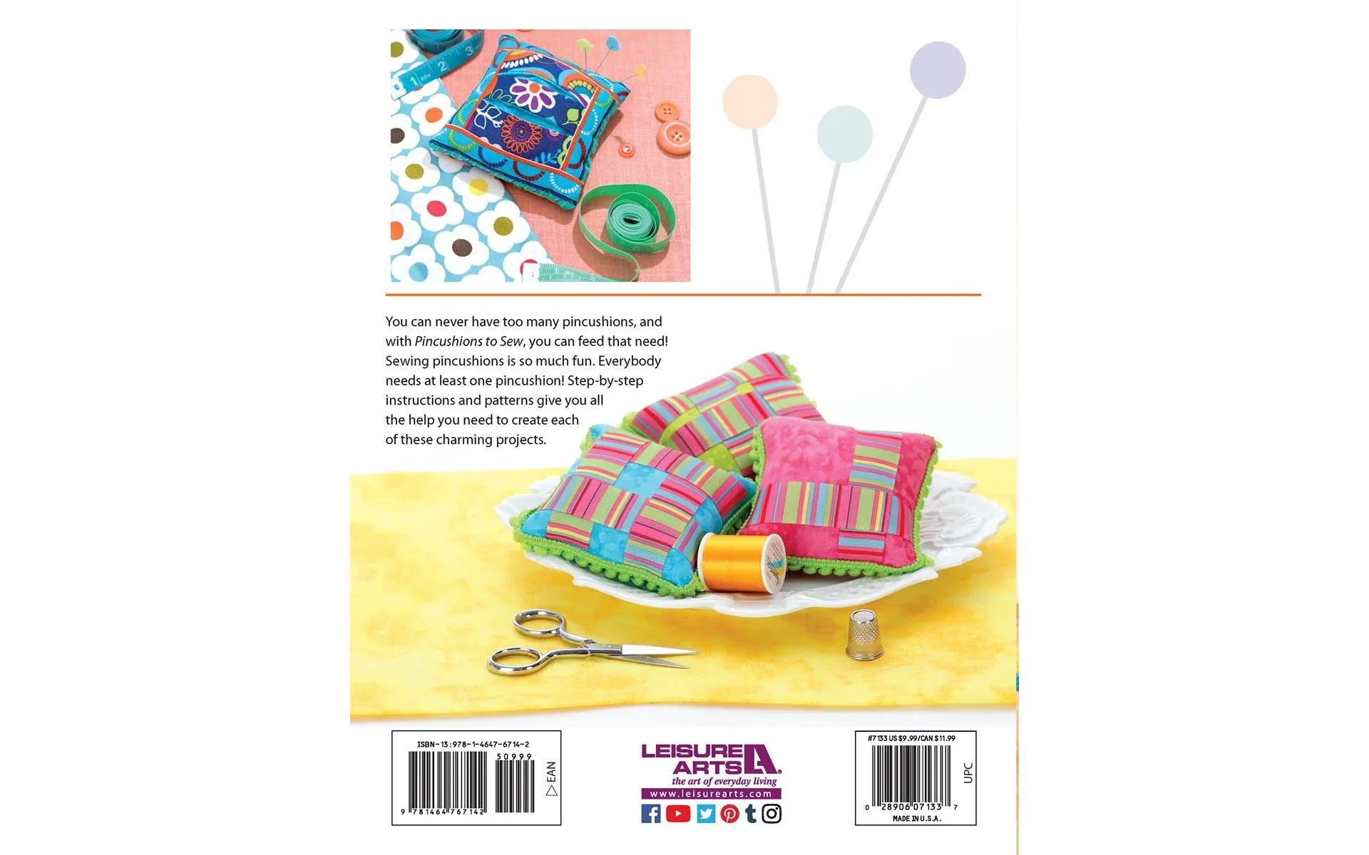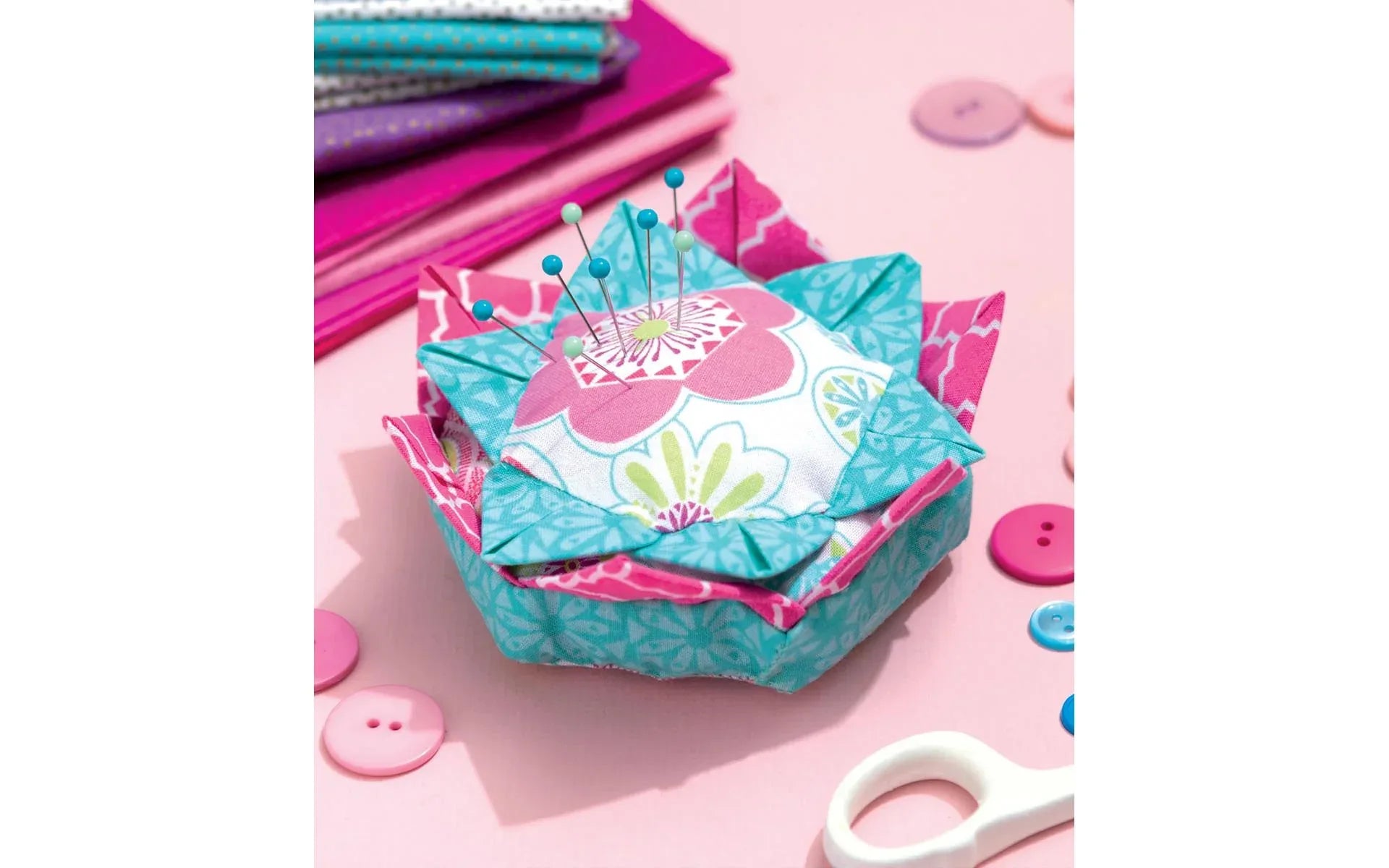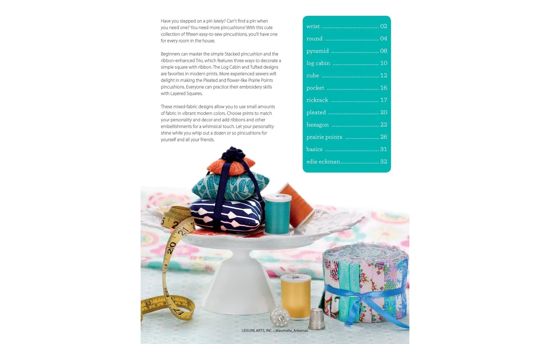 You can never have too many pincushions. Beginners can master the stacked pincushion and the trim-enhanced trio, which features three ways to decorate a square with ribbon and mini ball fringe. The log cabin and tufted designs are favorites in modern prints. More experienced sewists will delight in making the pleated and flower-like prairie point pincushions. Practice simple embroidery skills with layered squares.