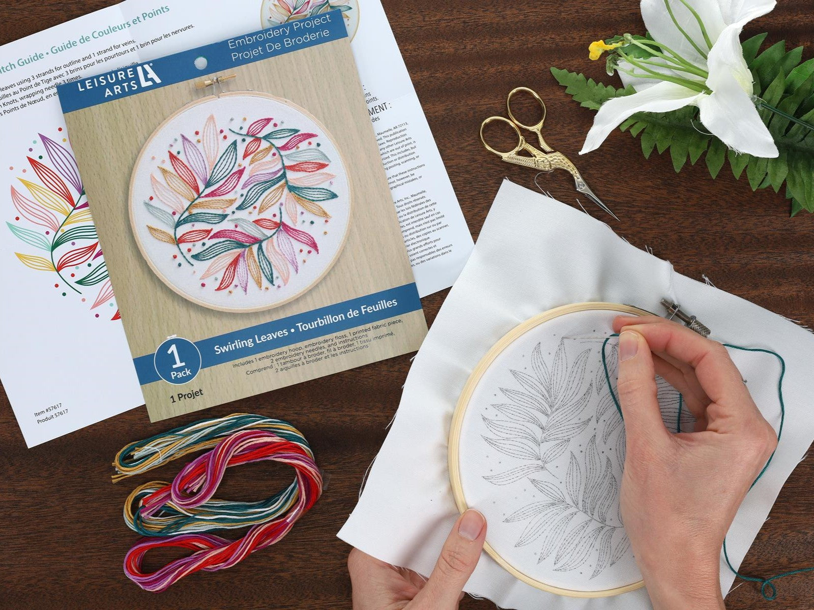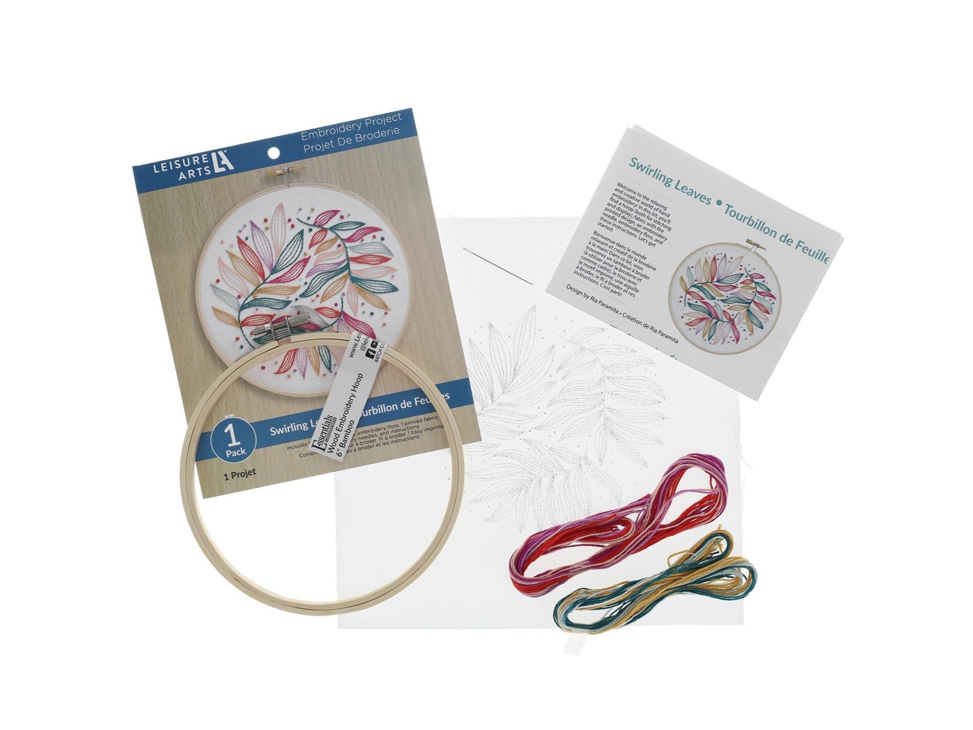 Printed embroidery design features multi colored swirling leaves. Use the embroidery hoop to keep the fabric taught and then to display your project.