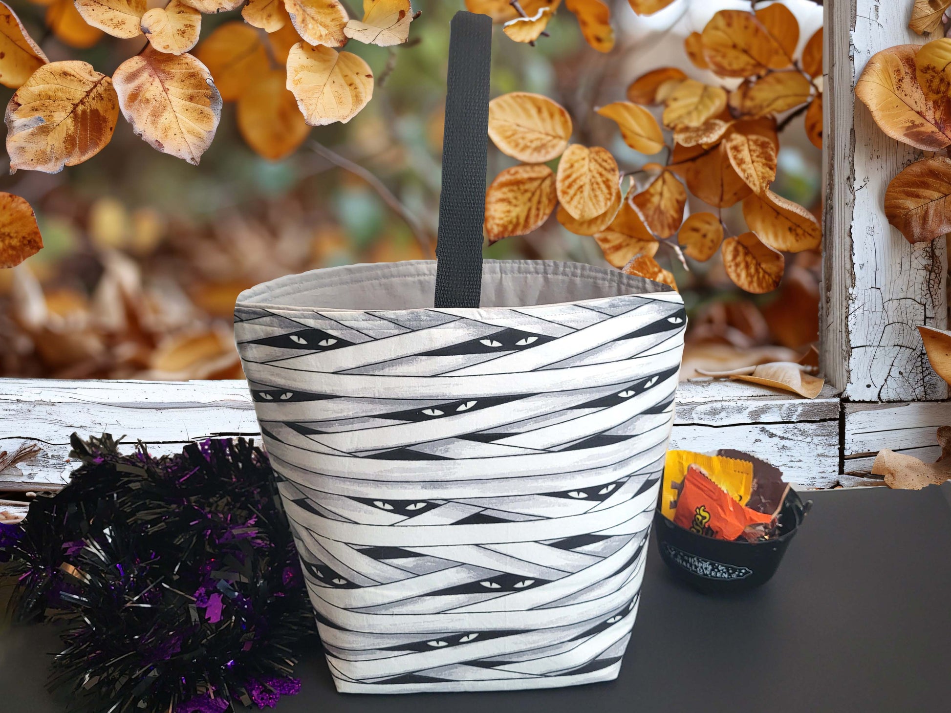 Have fun this Halloween with this mummy print bucket tote bag. Use as a trick-or-treat candy bucket or as a tote to carry your spooky yarn project or other crafts.