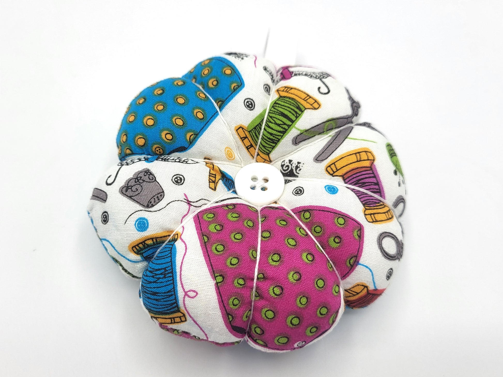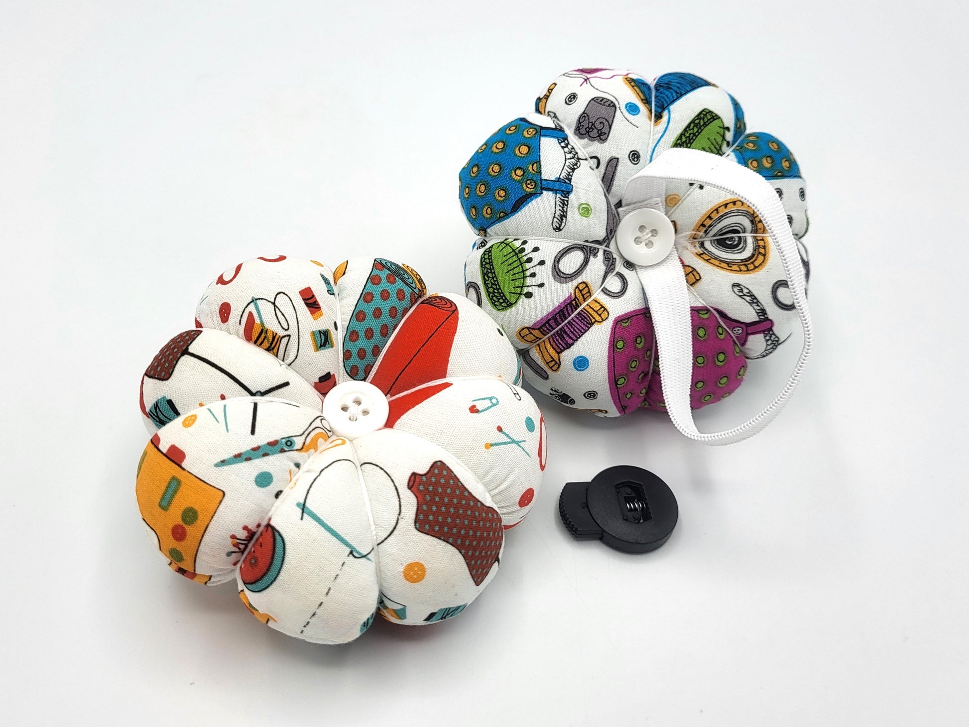 Cute wearable pumpkin shaped wrist pin cushion with elastic band. Available in 2 prints with various sewing notions.